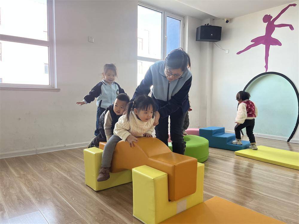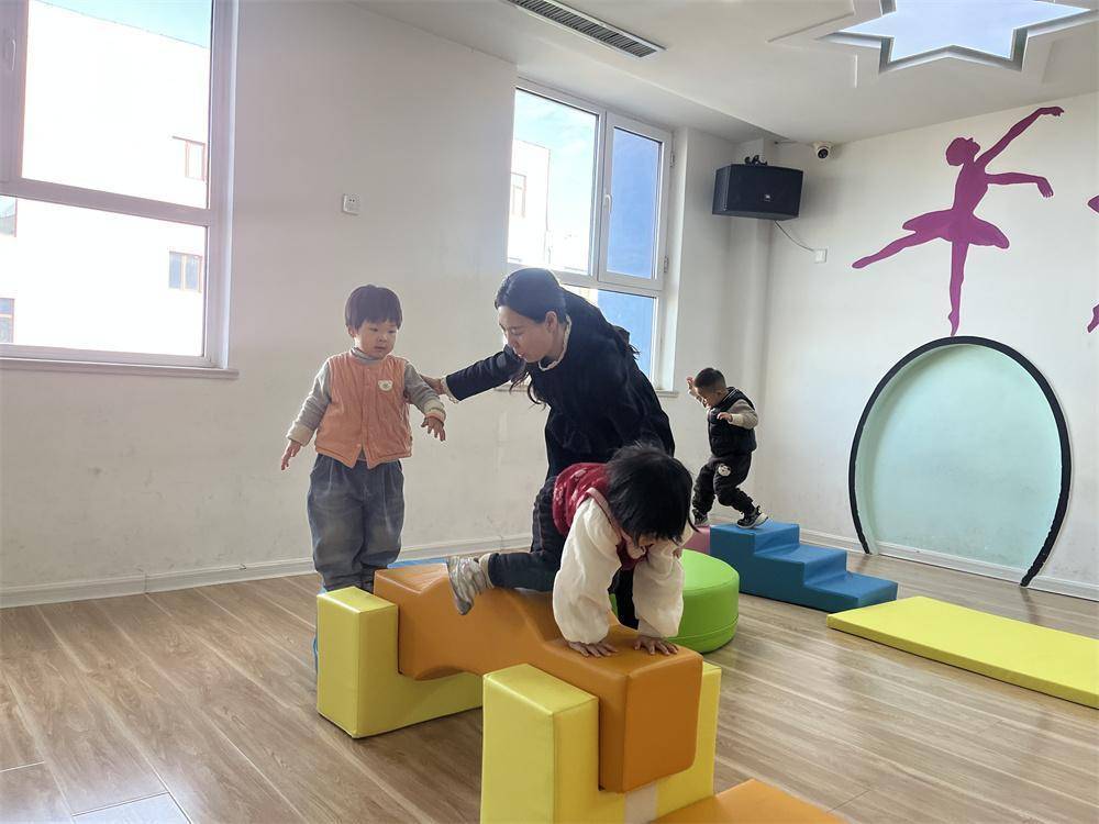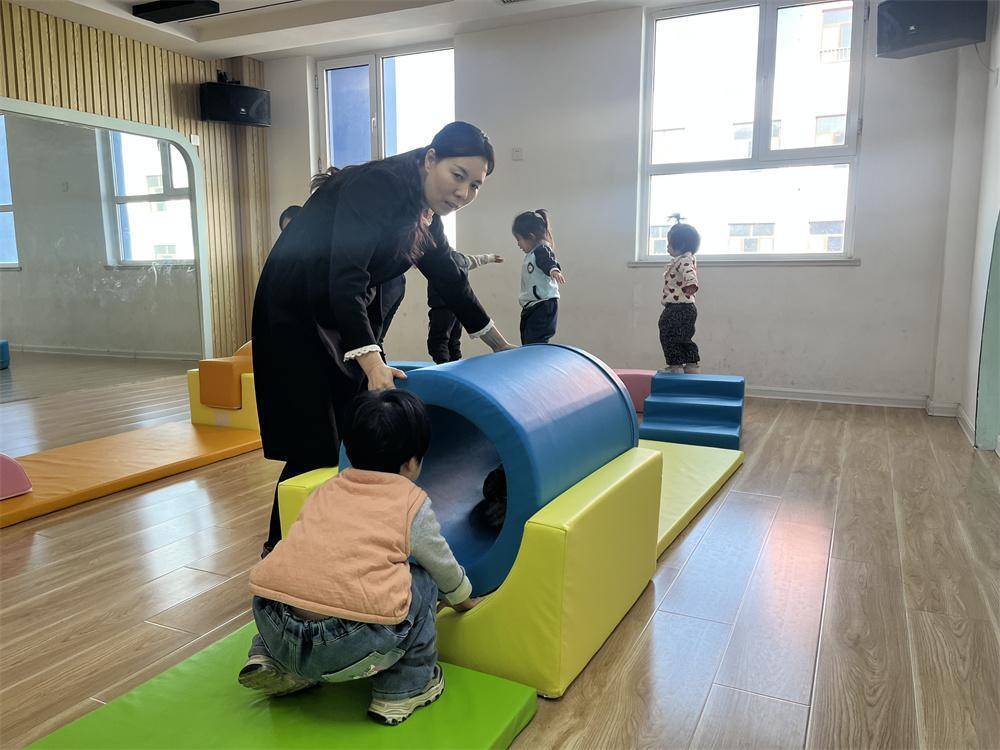 幼儿园老师辅导孩子利用感统器材训练。郭强摄钻筒里探出一张张稚嫩的小脸,跳马上传来阵阵清脆的笑声,拱桥上孩子们有序穿梭嬉戏……连日来,河北省迁安市19家普惠托育机构的托班教室中,都呈现出这样热闹温馨的场景。随着19套(每套17件套)大型感统训练器材陆续配送到位,300余名3周岁以下婴幼儿有了专业的感统训练平台,在趣味游戏中收获快乐、健康成长。